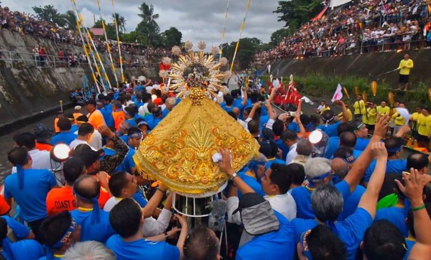 What began as a practical expedient during the time of Manuel Grijalvo, Bishop of Caceres (1848-61), that is to accommodate more devotees and pilgrims, has evolved into a leitmotif that portends a week of religious enthusiasm and energy. The traslacion from the Spanish transladar, meaning to translate or to transfer, is the opening salvo for nine days of prayers. On the afternoon prior to the first day of the novena the images of the Ina and the Divino Rostro are brought in procession to the Cathedral. Formerly, these images were kept in the shrine built by Francisco Gainza, Bishop of Caceres (1862-79), but with the consecration of a new Basilica in 1982 at a site on the opposite bank where the shrine stands, the traslacion today begins at the Basilica. The images mounted on andas or palanquins are carried aloft by men called boyadores. The procession does not move easily but starts and stops, weaves left and right, as other men push their way closer to take their turn in bearing the cherished images. Once arrived at the Cathedral, a good hour or so later, the images are enthroned on altars for the Masses that follow.